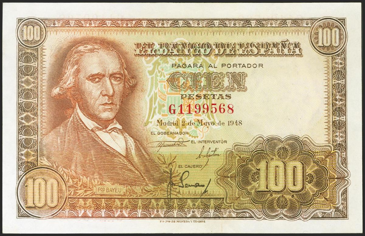 100 Pesetas. 2 de Mayo de 1948. Serie G. (Edifil 2021: 456a). Conserva parte del apresto original. EBC+.