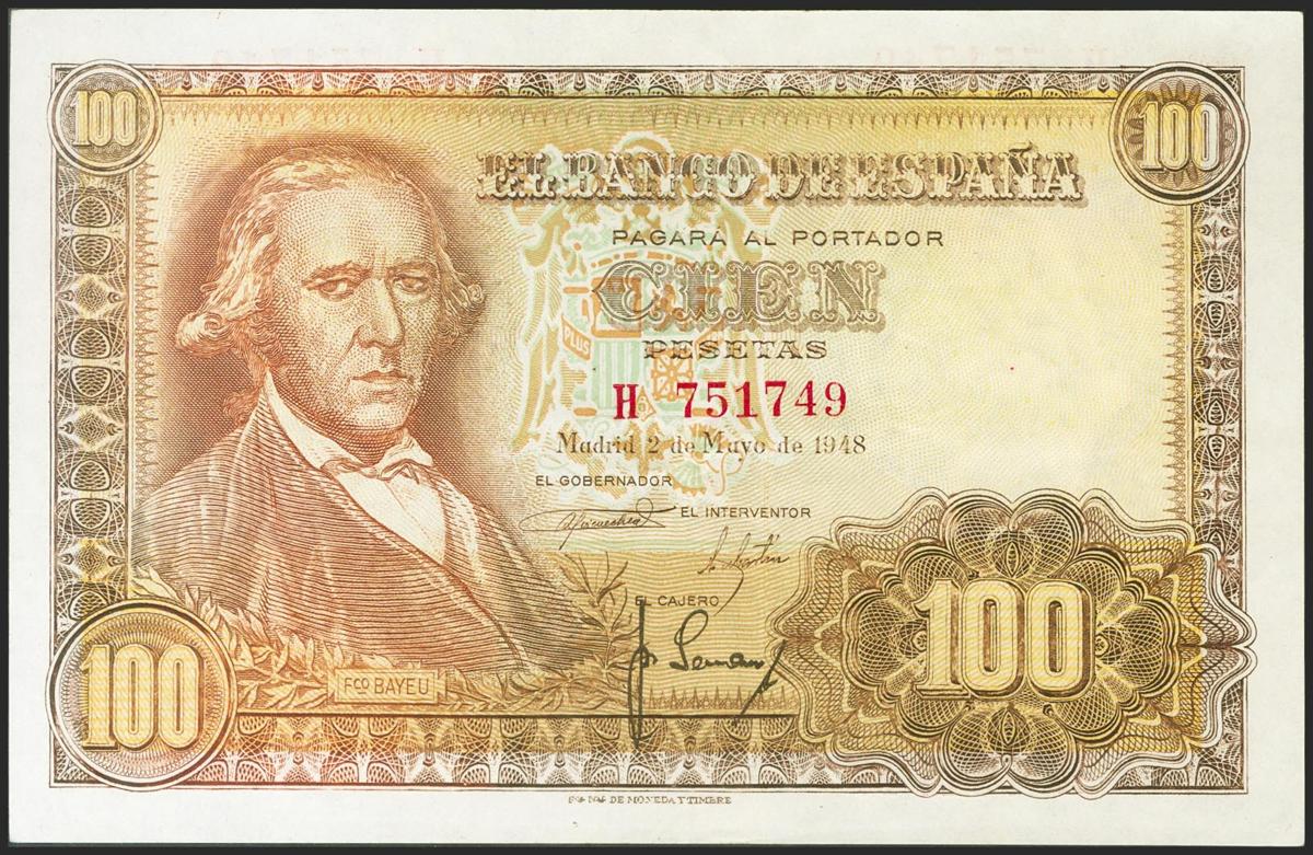 100 Pesetas. 2 de Mayo de 1948. Serie H. (Edifil 2021: 456a). Conserva parte del apresto original. EBC.