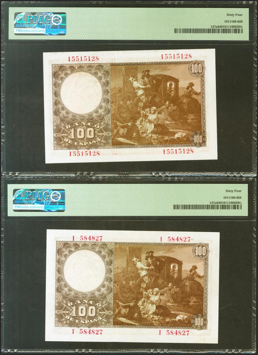 100 Pesetas. 2 de Mayo de 1948. Pareja correlativa. Serie I. (Edifil 2021: 456a). SC. Encapsulado PMG64.