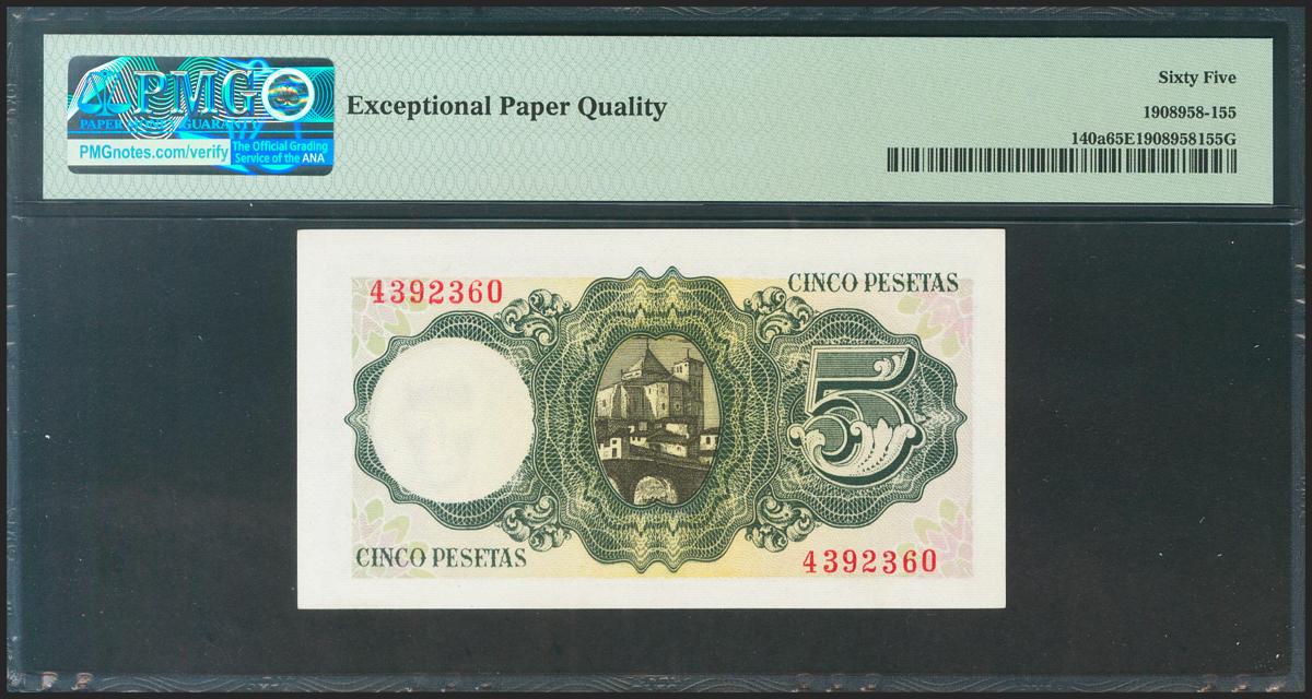 5 Pesetas. 16 de Agosto de 1951. Sin serie. (Edifil 2021: 459, Pick: 140a). Raro en esta calidad, apresto original. SC. Encapsulado PMG65EPQ.