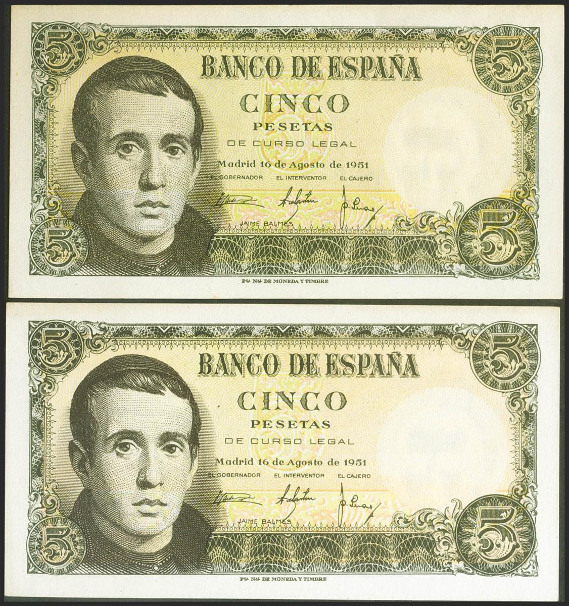 Conjunto de 2 billetes de 5 Pesetas emitidos el 16 de Agosto de 1951, con las series 1E y 1K, respectivamente. (Edifil 2021: 459a). Apresto original. SC-.