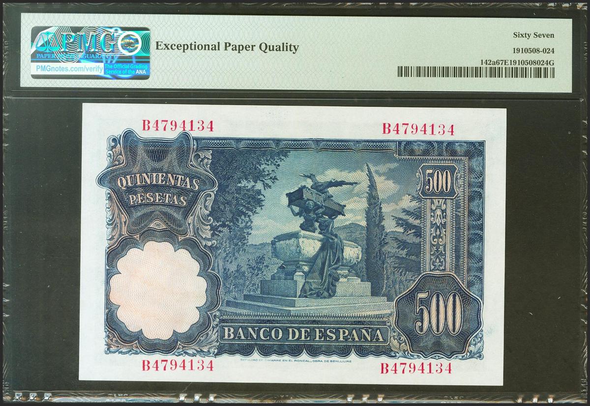 500 Pesetas. 15 de Noviembre de 1951. Serie B. (Edifil 2021: 460a). Extraordinariamente raro en esta excepcional calidad, conserva todo su apresto original. SC. Encapsulado PMG67EPQ.