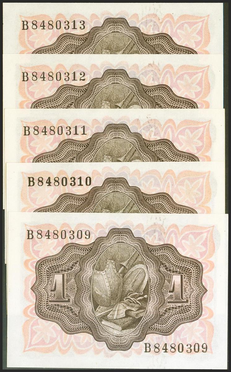Conjunto de 5 billetes correlativos de 1 Peseta emitidos el 19 de Noviembre de 1951, con la serie B (Edifil 2017: 461a), apresto original. SC/SC-.