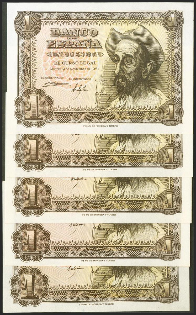 Conjunto de 5 billetes correlativos de 1 Peseta emitidos el 19 de Noviembre de 1951, con la serie B (Edifil 2017: 461a), apresto original. SC/SC-.