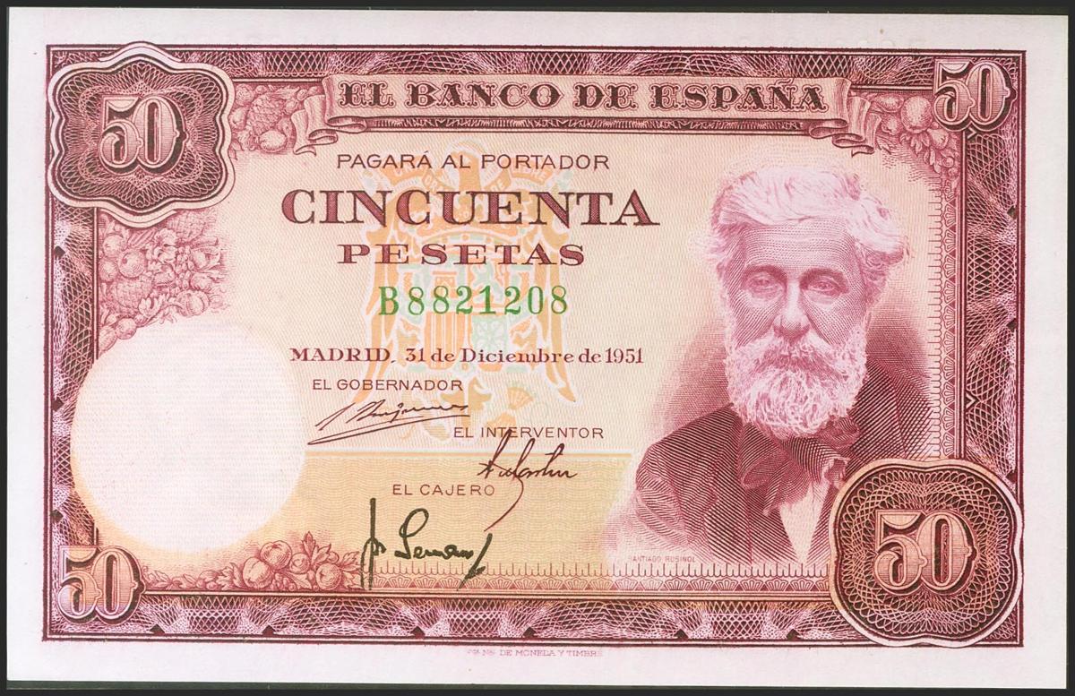 50 Pesetas. 31 de Diciembre de 1951. Serie B. (Edifil 2021: 462a). Inusual en esta superlativa calidad, conserva parte de su apresto original. SC.