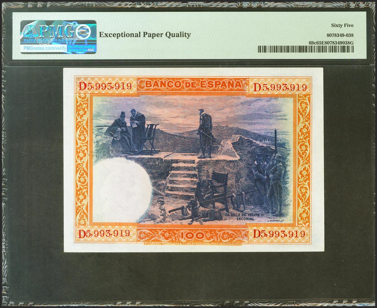 100 Pesetas. 1 de Julio de 1925. Serie D. (Edifil 2021: 350, Pick: 69c). Apresto original. SC. Encapsulado PMG65EPQ.
