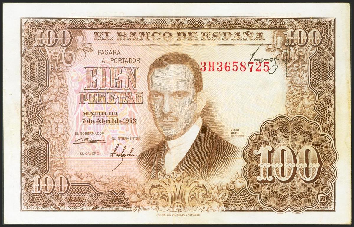 100 Pesetas. 7 de Abril de 1953. Serie 3H y con la variedad firma invertida y desplazada. (Edifil 2021: 464c). Inusual, conservando parte de su apresto original. EBC.