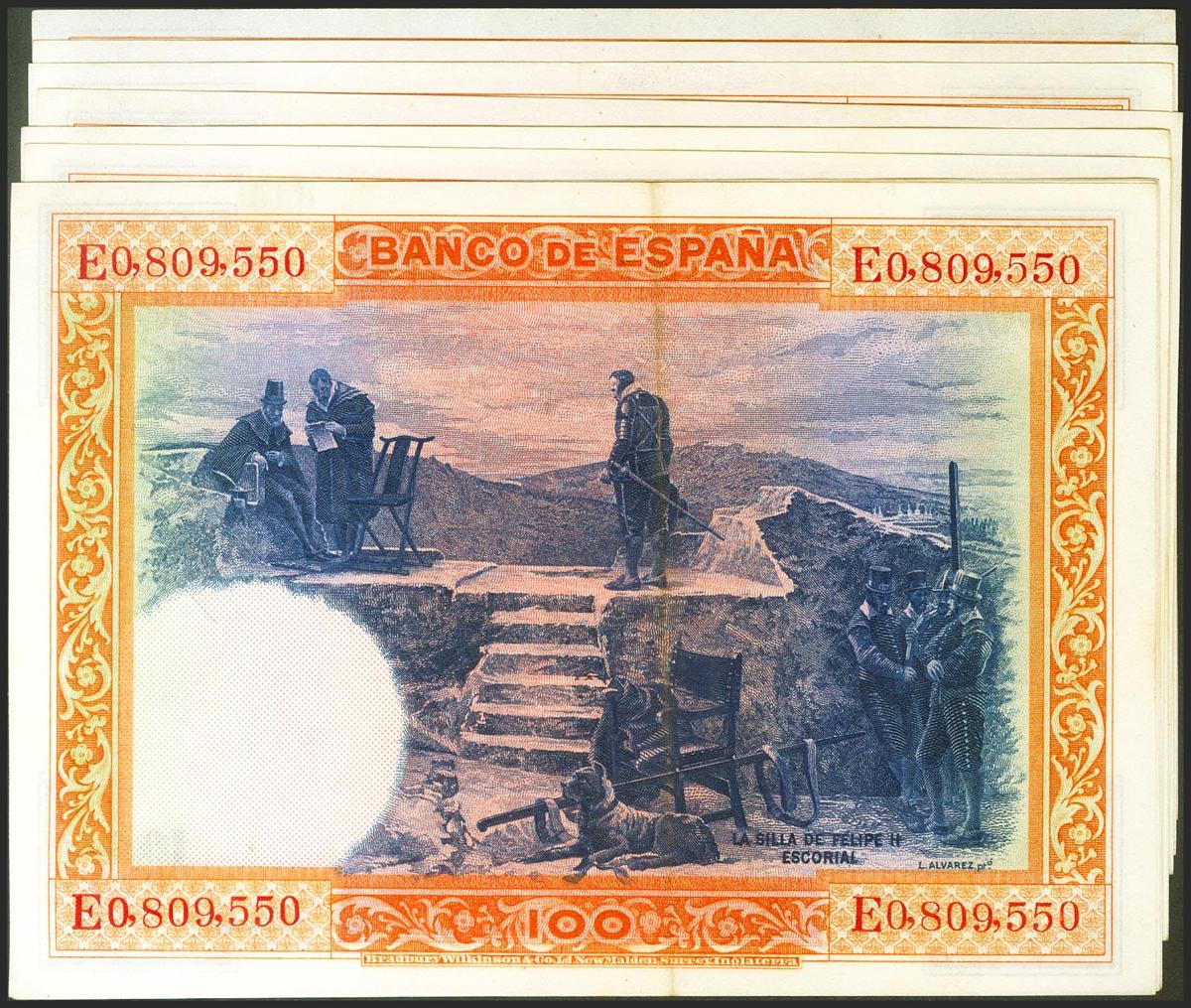 Conjunto de 10 billetes correlativos de 100 Pesetas emitidos el 1 de Julio de 1925 con la serie E (Edifil 2021: 350), conservando todo su apresto original. EBC+.
