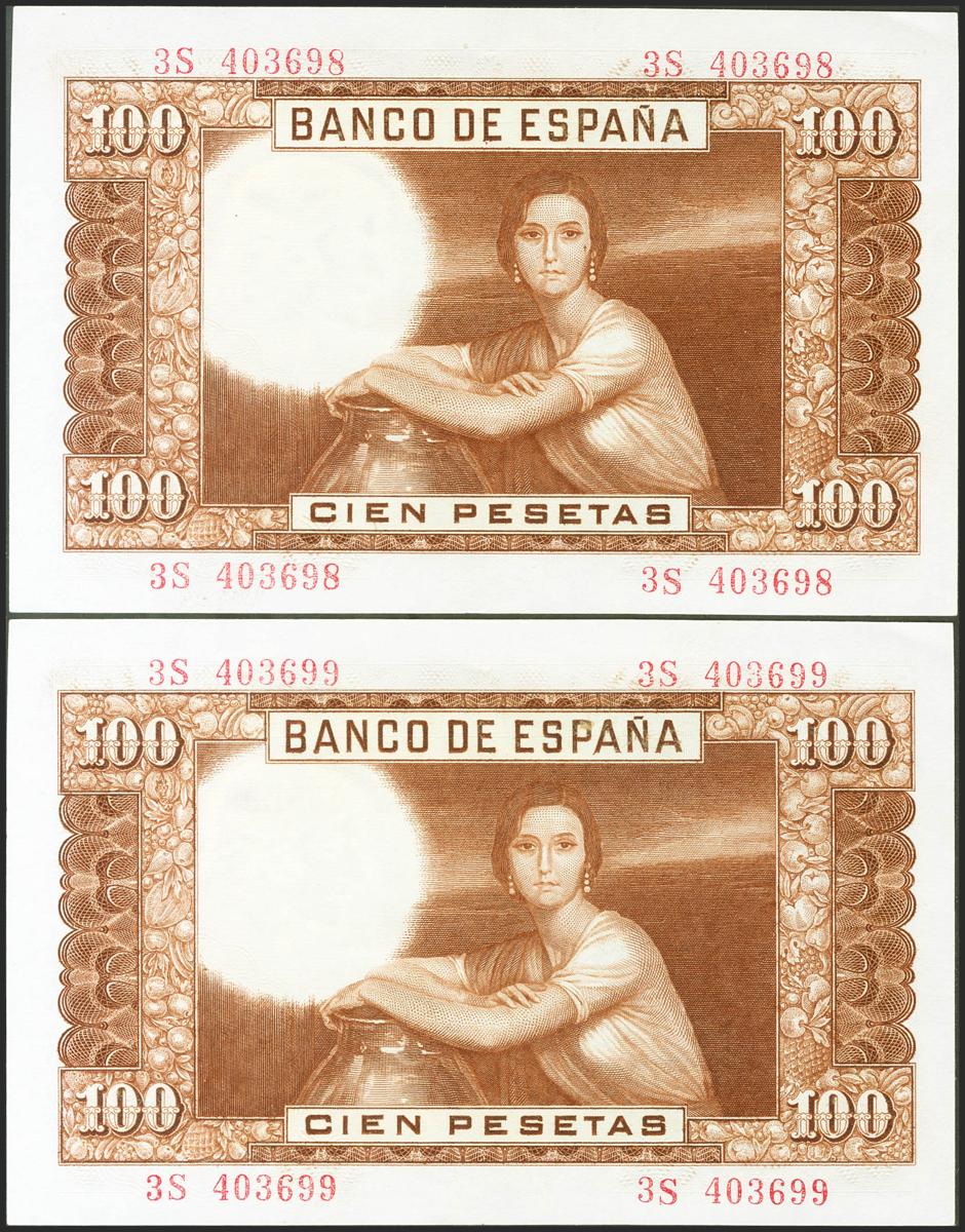 100 Pesetas. 7 de Abril de 1953. Pareja correlativa. Serie 3S. (Edifil 2021: 464c). Apresto original. SC-.