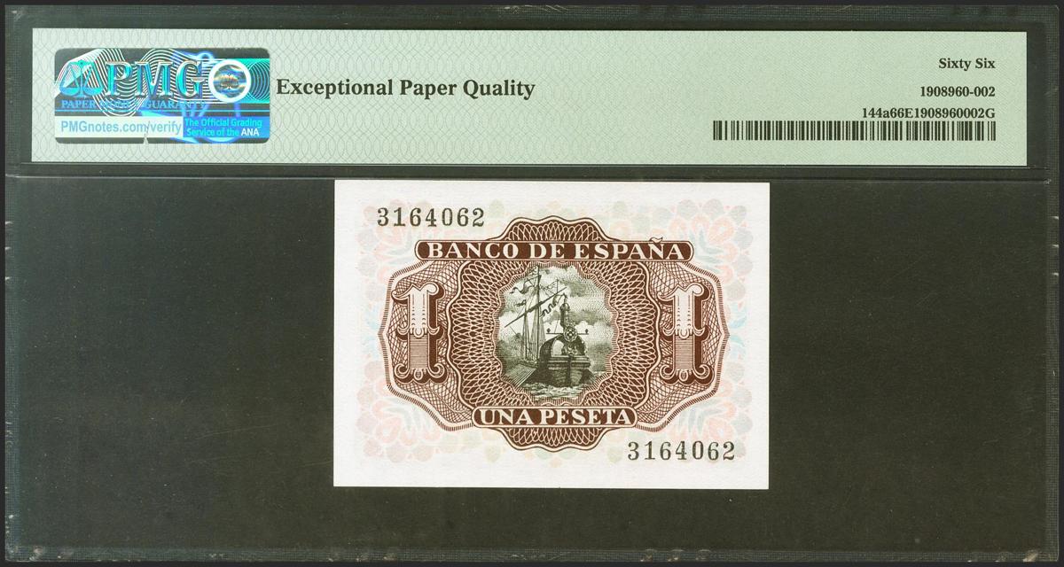 1 Peseta. 22 de Julio de 1953. Sin serie. (Edifil 2021: 465, Pick: 144a). Inusual en esta excepcional calidad, apresto original. SC. Encapsulado PMG66EPQ.
