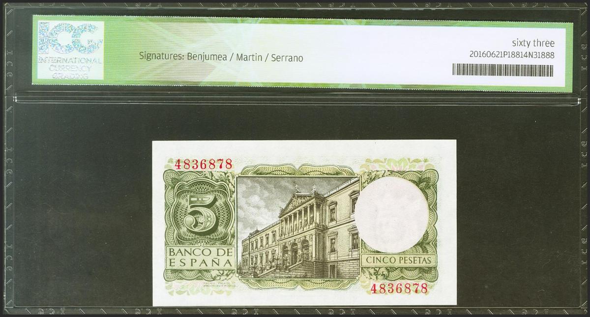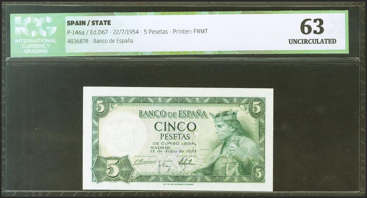 5 Pesetas. 22 de Julio de 1954. Sin serie. (Edifil 2021: 466, Pick: 146a). SC. Encapsulado ICG63.