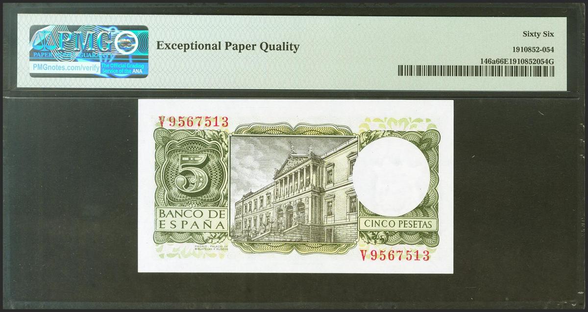 5 Pesetas. 22 de Julio de 1954. Serie V. (Edifil 2021: 466a, Pick: 146a). Inusual en esta excepcional calidad, apresto original. SC. Encpasulado PMG66EPQ.
