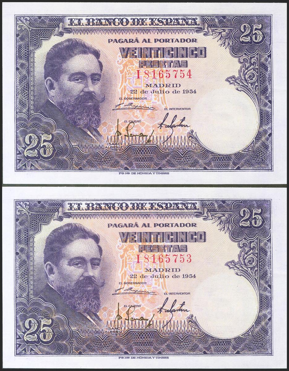 25 Pesetas. 22 de Julio de 1954. Pareja correlativa. Serie I. (Edifil 2021: 467a). Apresto original. SC-.