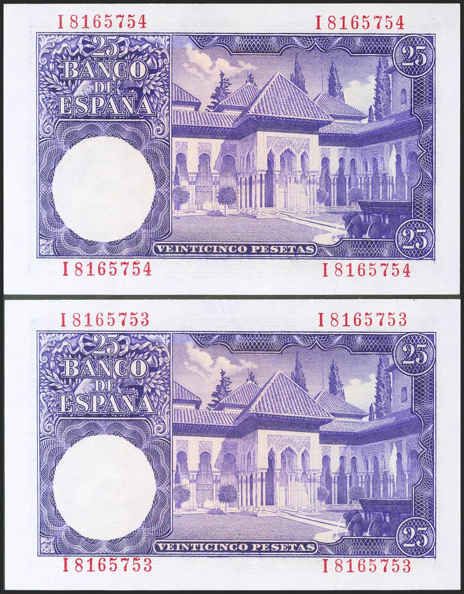 25 Pesetas. 22 de Julio de 1954. Pareja correlativa. Serie I. (Edifil 2021: 467a). Apresto original. SC-.