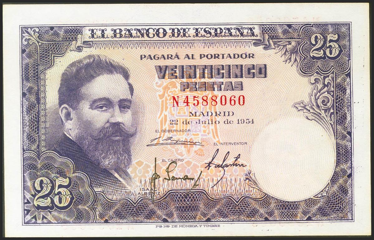 25 Pesetas. 22 de Julio de 1954. Serie N. (Edifil 2021: 467a). Conserva todo el apresto original. SC-.
