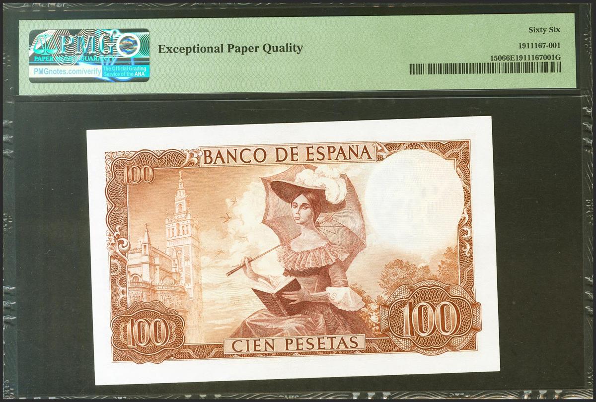 100 Pesetas. 19 de Noviembre de 1965. Sin serie. (Edifil 2021: 470, Pick: 150). Inusual en esta excepcional calidad, apresto original. SC. Encapsulado PMG66EPQ.
