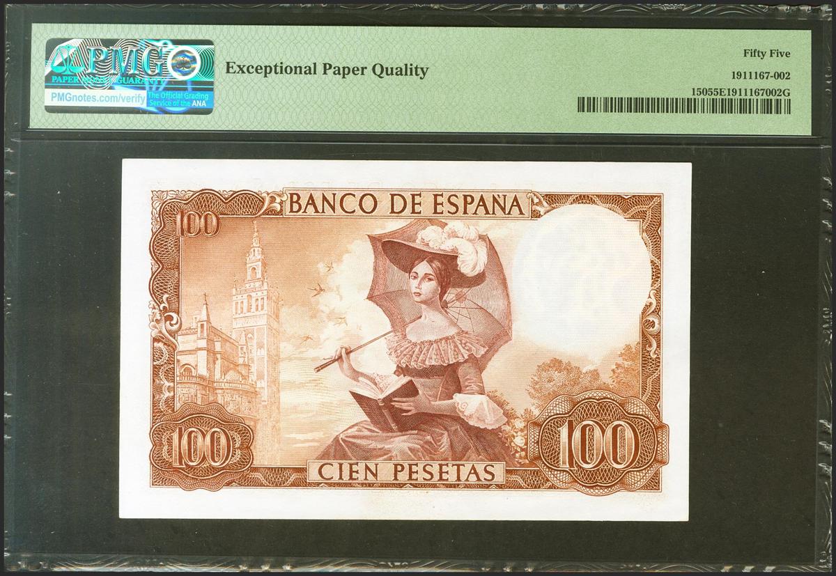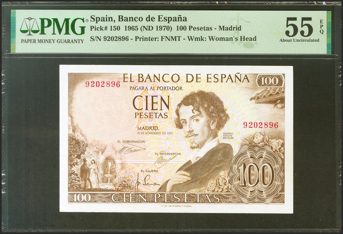 100 Pesetas. 19 de Noviembre de 1965. Sin serie. (Edifil 2021: 470, Pick: 150). Apresto original. EBC+. Encapsulado PMG55EPQ.
