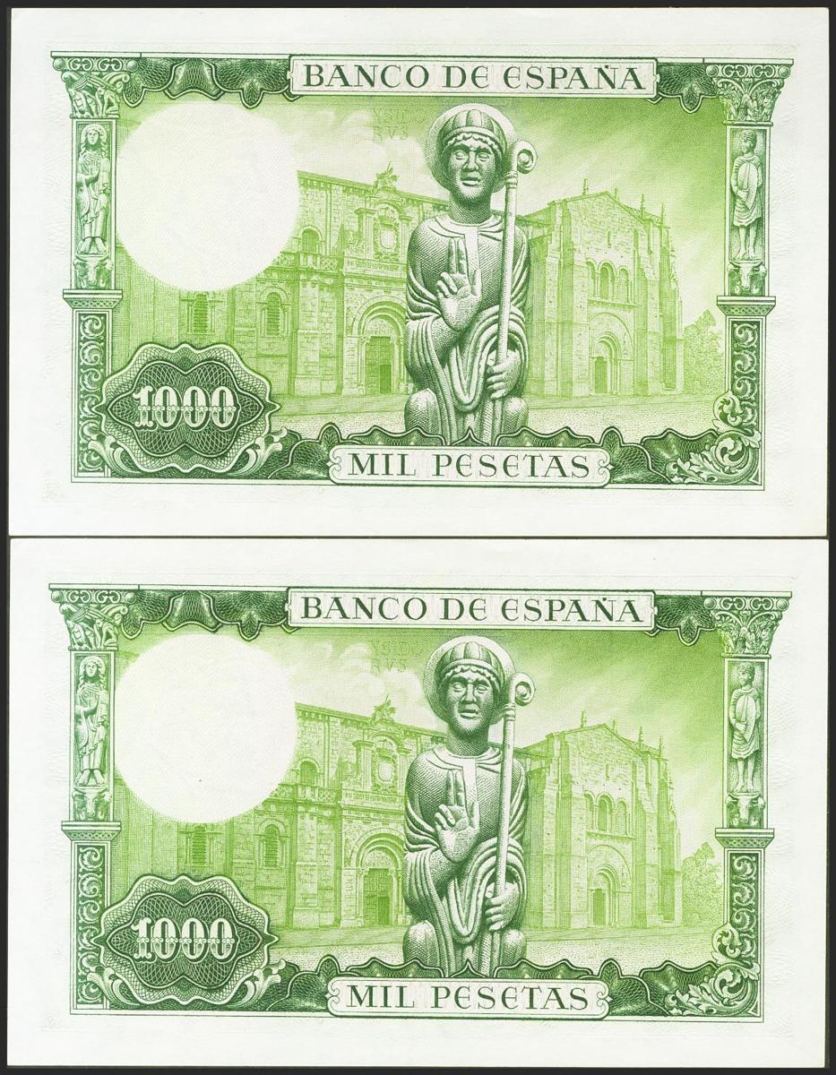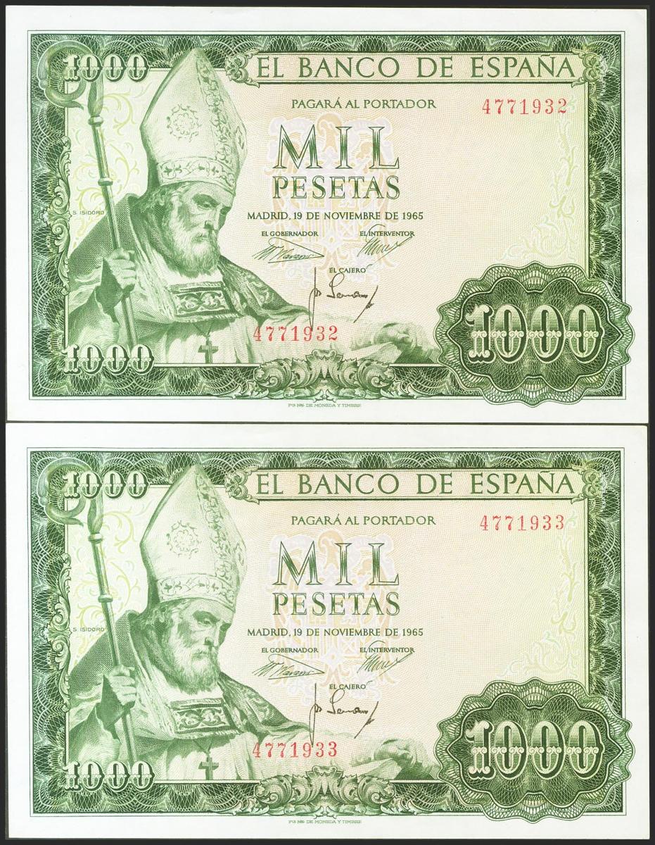 1000 Pesetas. 19 de Noviembre de 1965. Pareja correlativa. Sin serie. (Edifil 2021: 471). Conserva todo su apresto original. EBC+++.