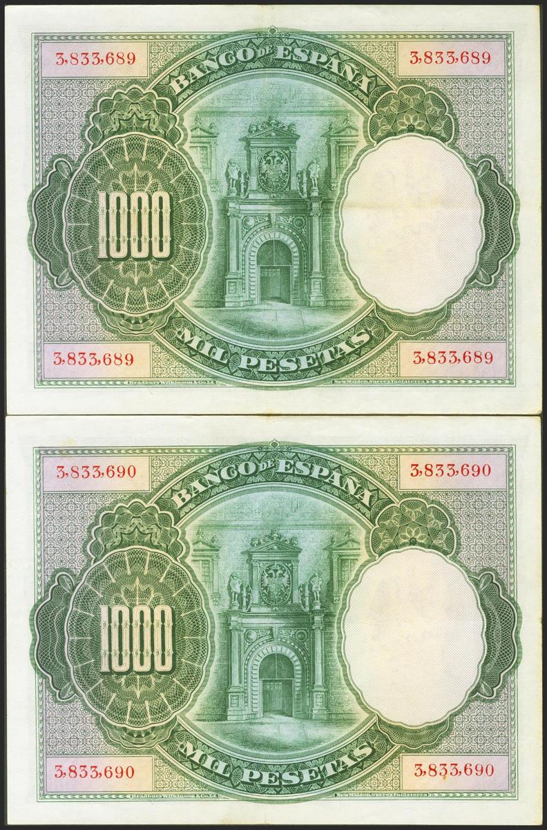 1000 Pesetas. 1 de Julio de 1925. Pareja correlativa. Sin serie y numeración posterior al 3646000. (Edifil 2021: 351, Pick: 70c). Conserva parte del apresto original. EBC.
