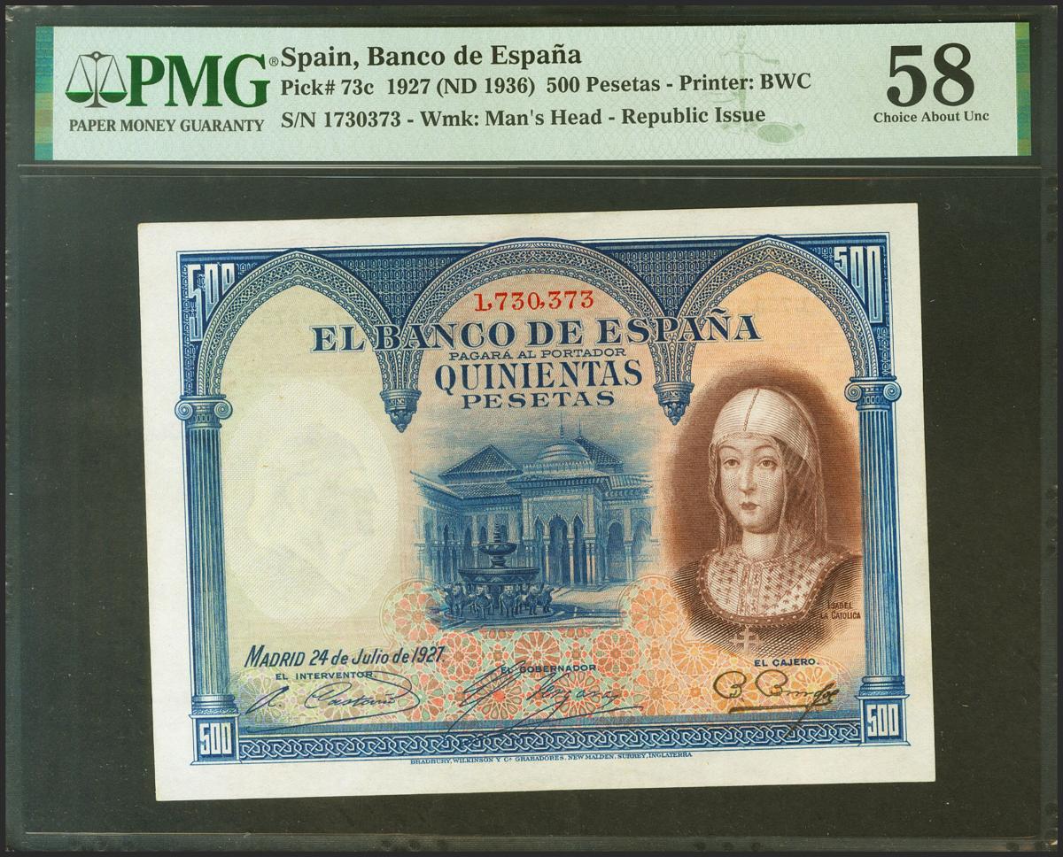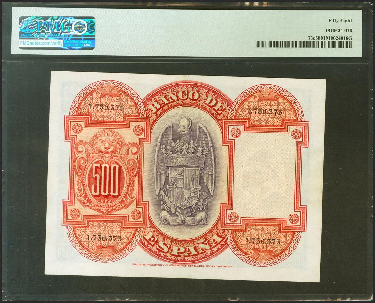 500 Pesetas. 24 de Julio de 1927. Sin serie y numeración posterior 1602000. (Edifil 2021: 352, Pick: 73c). Inusual en esta calidad. EBC++. Encapsulado PMG58.