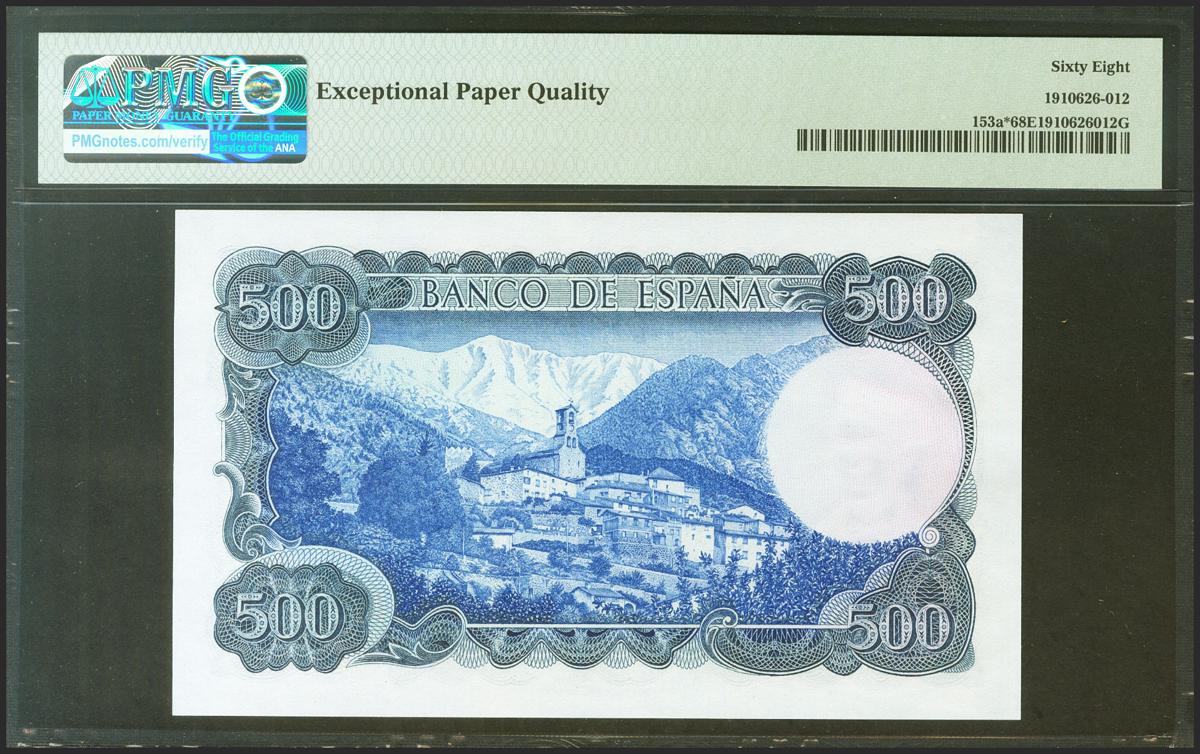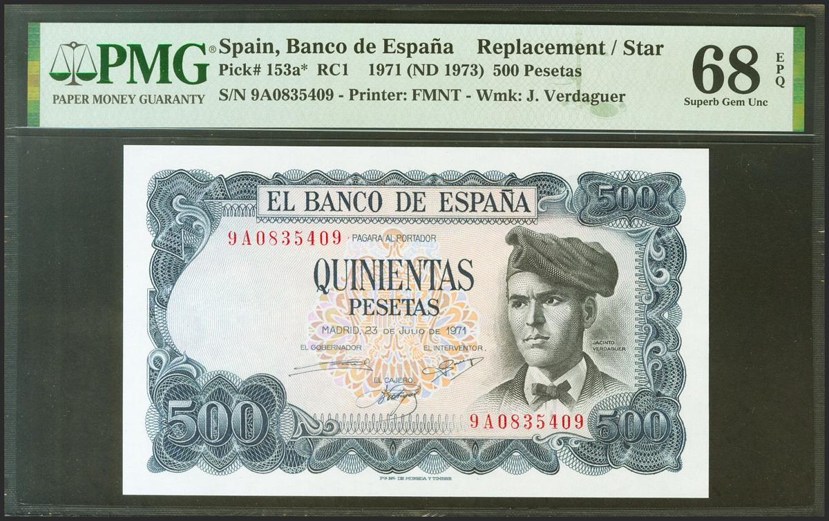 500 Pesetas. 23 de Julio de 1971. Serie especial 9A. (Edifil 2021: 473b, Pick: 153a*). Rarísimo en esta excepcional calidad. SC. Encapsulado PMG68EPQ.