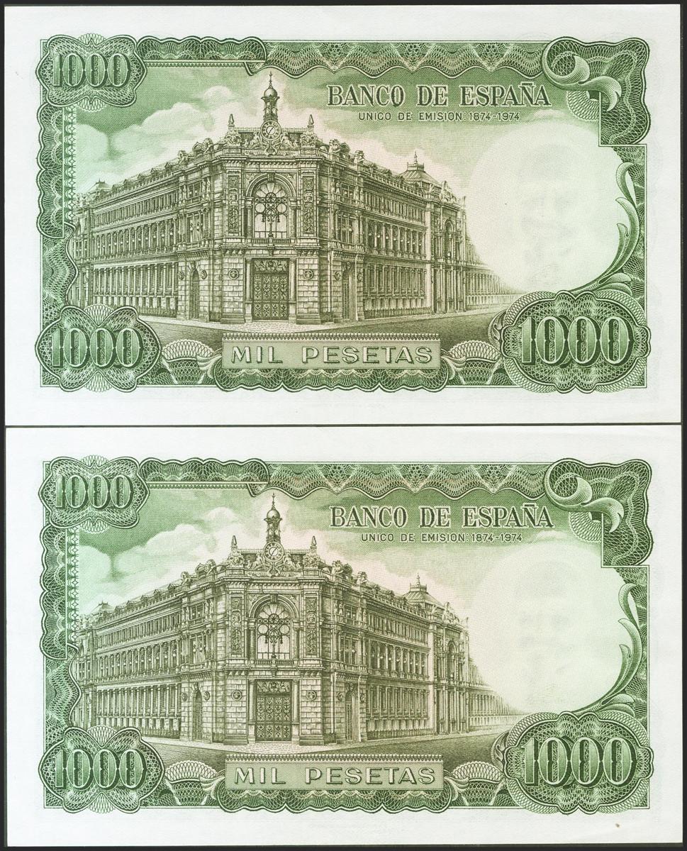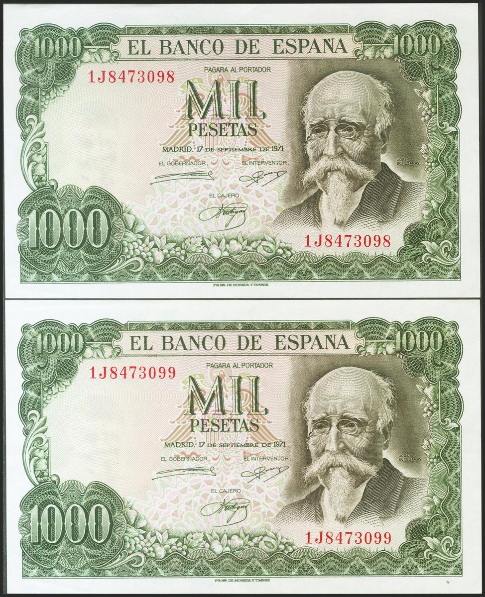 1000 Pesetas. 17 de Septiembre de 1971. Pareja correlativa. Serie 1J. (Edifil 2021: 474c). Conserva todo su apresto original. SC-.