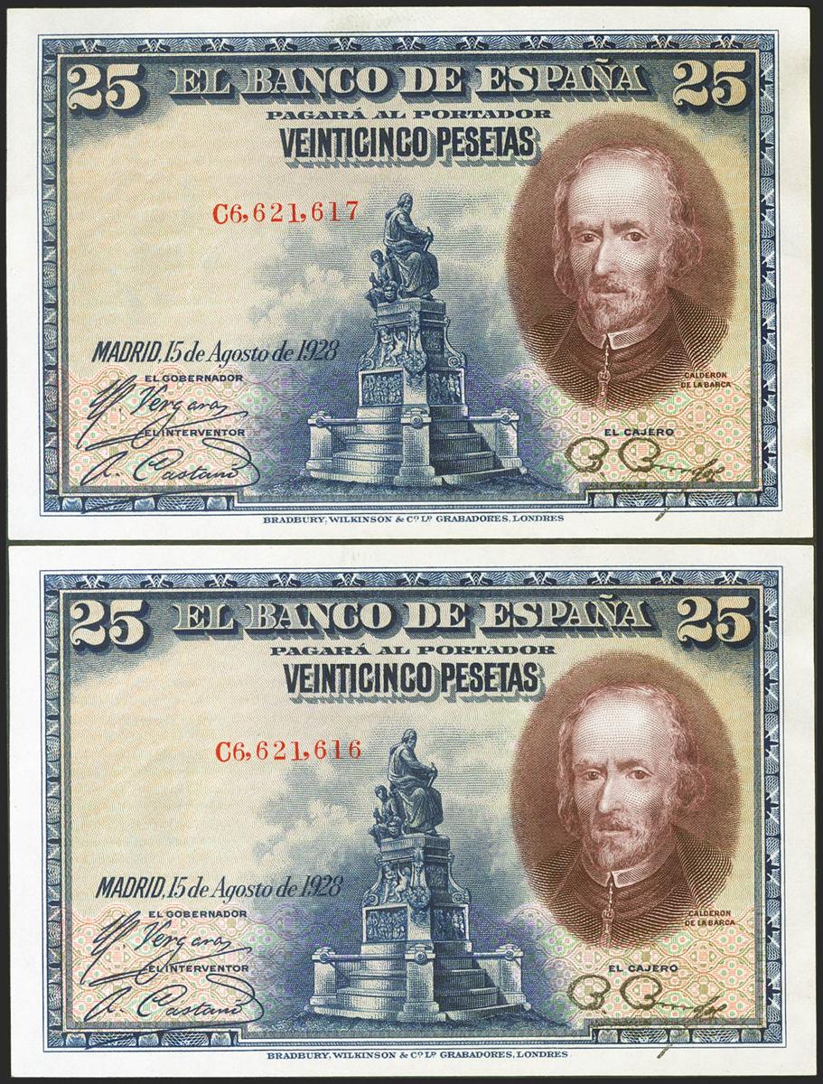 25 Pesetas. 15 de Agosto de 1928. Pareja correlativa. Serie C. (Edifil 2021: 353). Apresto original. SC-.