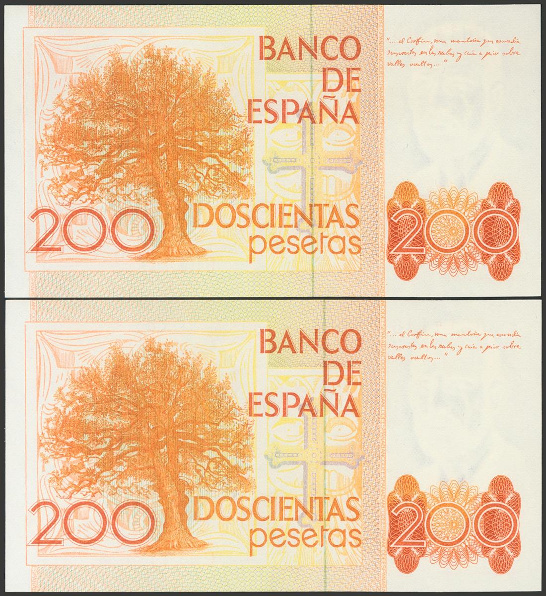 200 Pesetas. 16 de Septiembre de 1980. Pareja correlativa. Sin serie y numeración muy baja. (Edifil 2017: 480). SC.