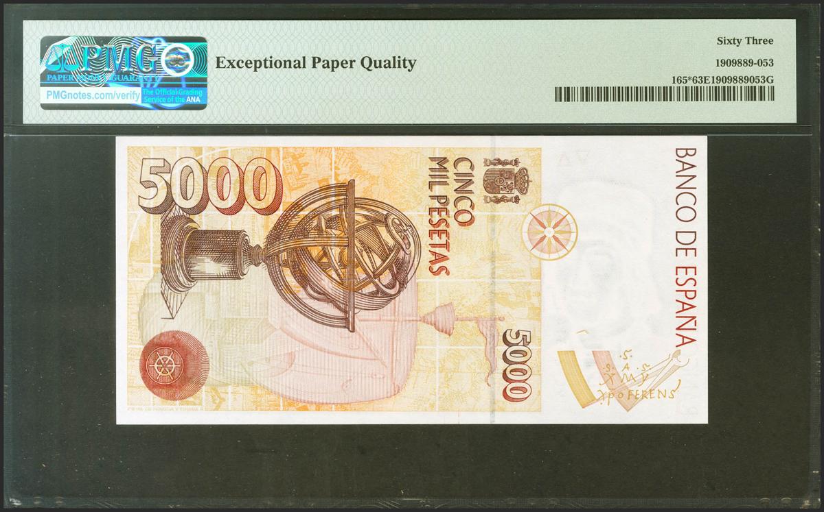 5000 Pesetas. 12 de Octubre de 1992. Serie especial 9C. (Edifil 2021: 484b, Pick: 165*). Apresto original. SC. Encapsulado PMG63EPQ.