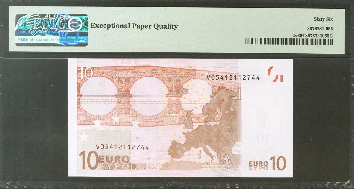 10 Euros. 1 de Enero de 2002. Firma Duisenberg. Serie V (España). (Edifil 2021: 487, Pick: 2v). SC. Encapsulado PMG66EPQ.