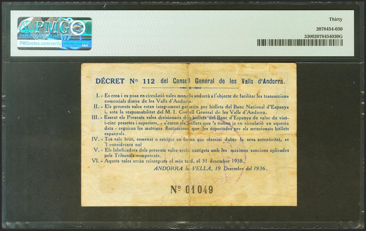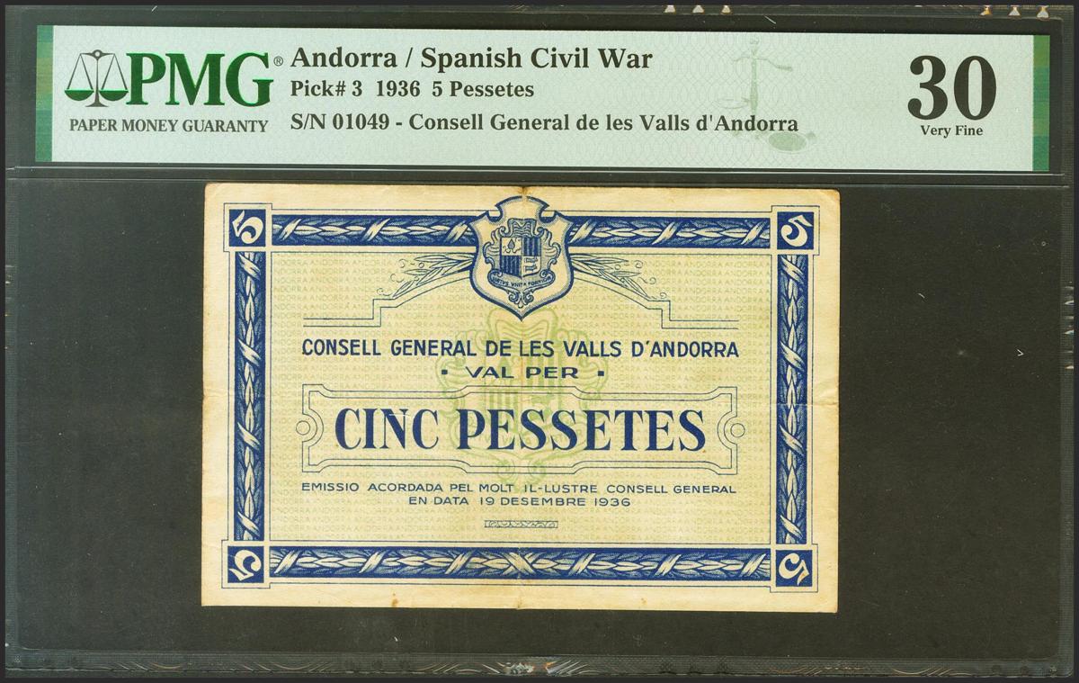 ANDORRA. 5 Pessetes. 19 de Diciembre de 1936. Sin serie. (Edifil 2021: 5, Pick: 3). MBC. Encapsulado PMG30.
