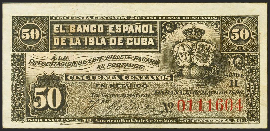 BANCO ESPAÑOL DE LA ISLA DE CUBA. 50 Centavos. 15 de Mayo de 1896. Serie H. (Edifil 2021: 70). Apresto original. SC.