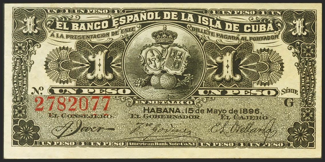 BANCO ESPAÑOL DE LA ISLA DE CUBA. 1 Peso. 15 de Mayo de 1896. Serie G. (Edifil 2021: 71). Apresto original. SC.