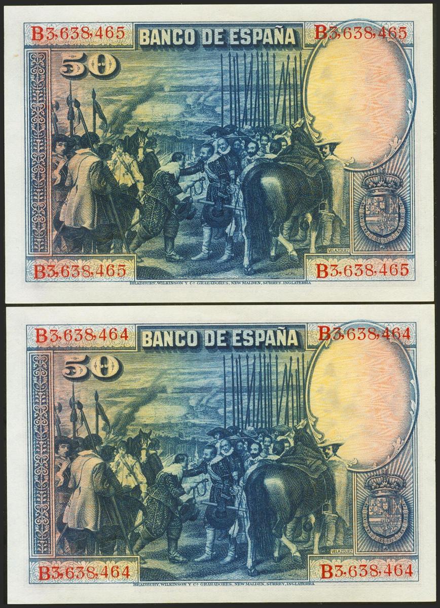 50 Pesetas. 15 de Agosto de 1928. Pareja correlativa. Inusual serie B. (Edifil 2021: 354). Apresto original. SC.