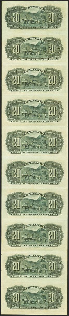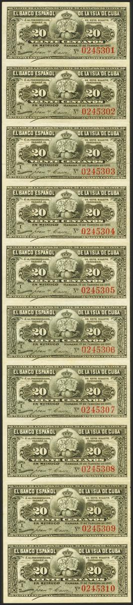 BANCO ESPAÑOL DE LA ISLA DE CUBA. 20 Centavos. 15 de Febrero de 1897. Pliego completo de 10 billetes. Serie I. (Edifil 2017: 85). Inusual. SC/SC-.