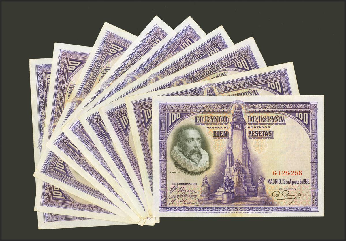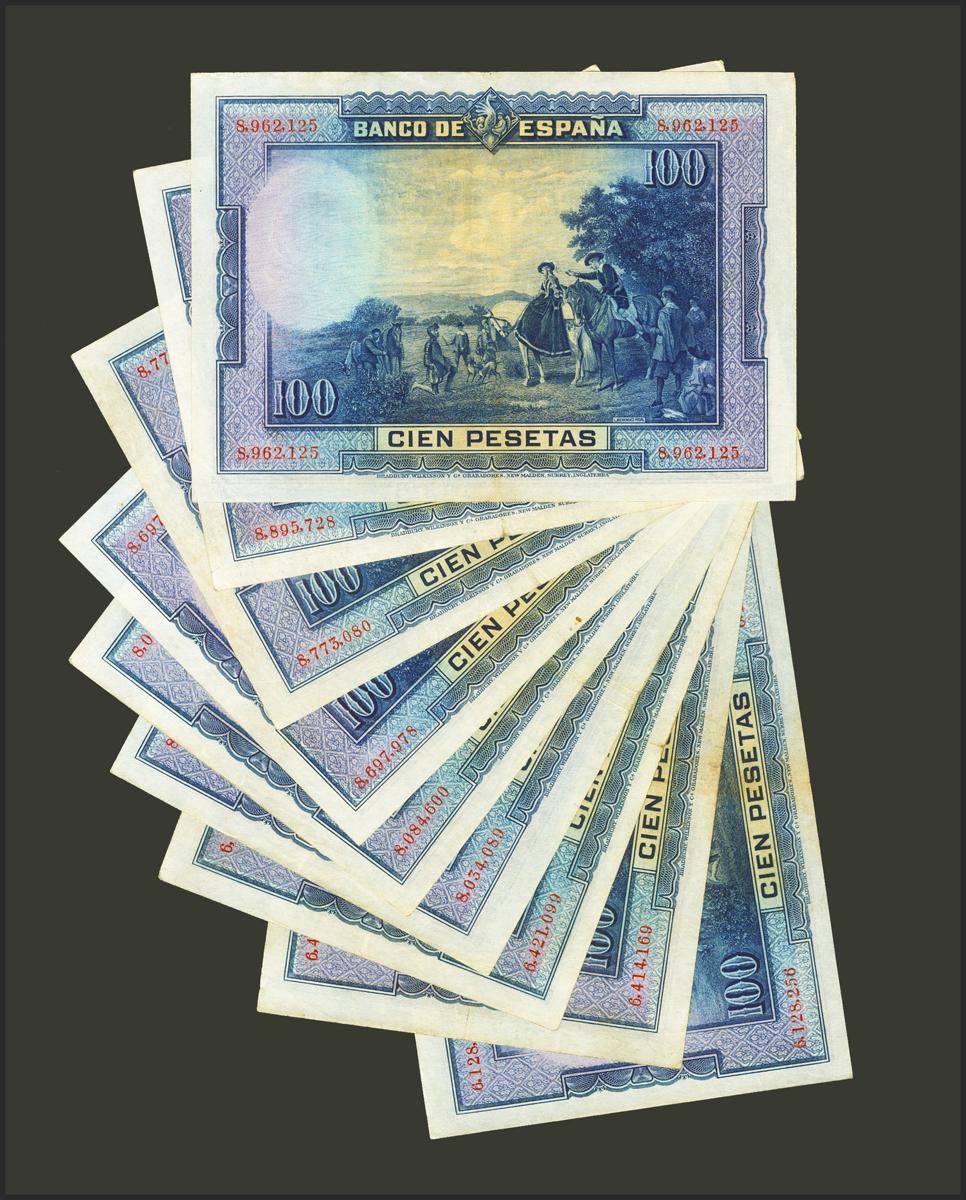 Conjunto de 9 billetes de 100 Pesetas emitidos el 15 de Agosto de 1928, sin serie. (Edifil 2021: 355). EBC/MBC-. A EXAMINAR.