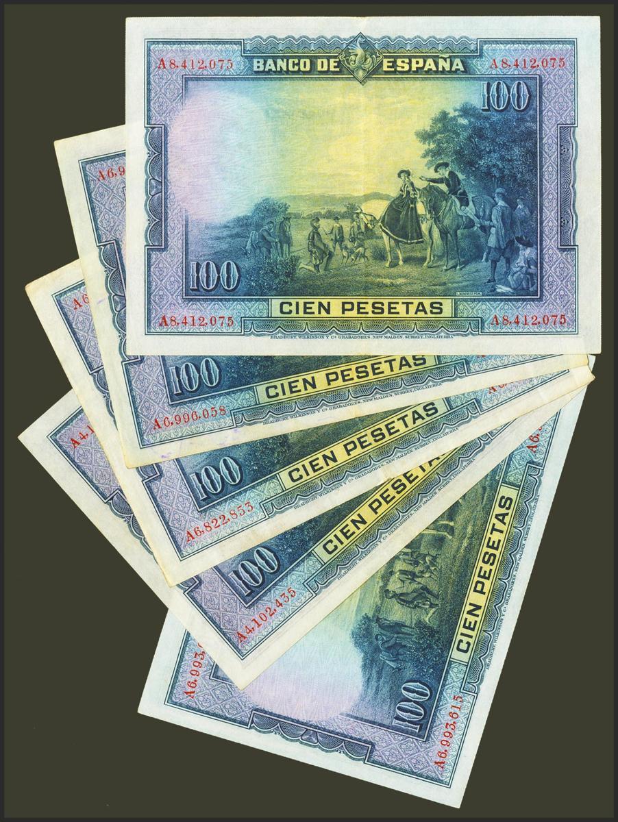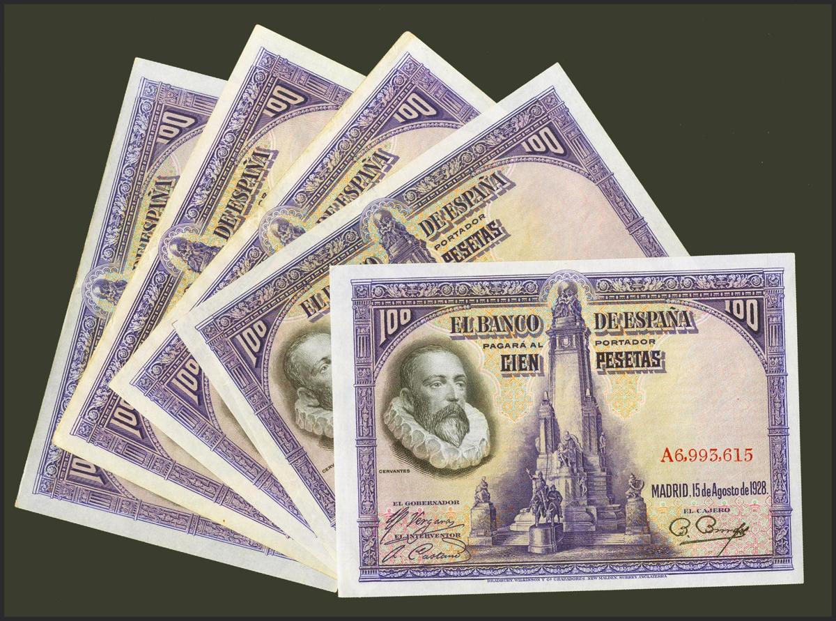 Conjunto de 5 billetes de 100 Pesetas emitidos el 15 de Agosto de 1928 con la serie A. (Edifil 2021: 355a). EBC/MBC-.