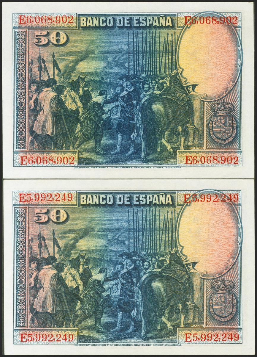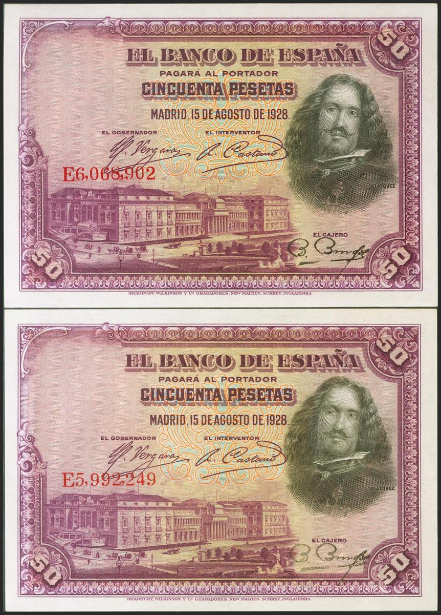 Conjunto de 2 billetes de 50 Pesetas emitidos el 15 de Agosto de 1928 con la serie E (Edifil 2021: 354), conserva su apresto original. SC.