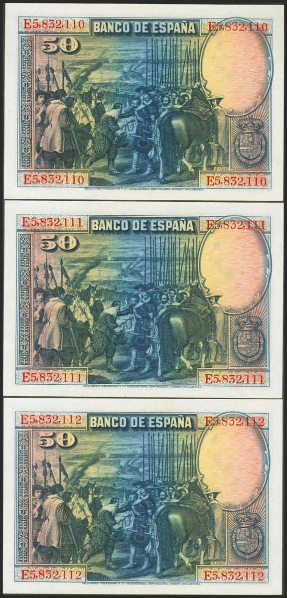 50 Pesetas. 15 de Agosto de 1928. Trío correlativo. Serie E. (Edifil 2021: 354). Apresto original. SC.