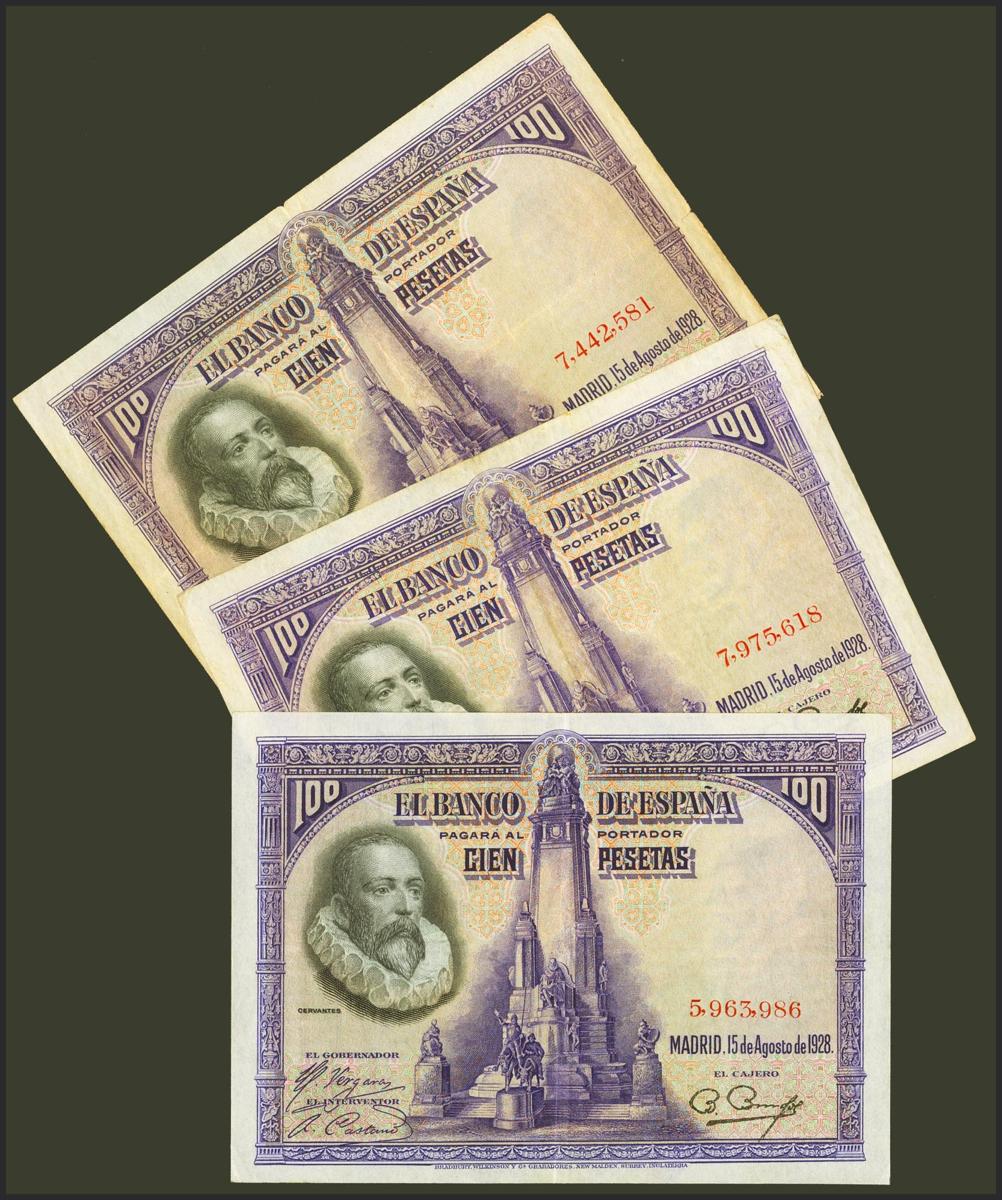 Conjunto de 3 billetes de 100 Pesetas emitidos el 15 de Agosto de 1928 sin serie. (Edifil 2021: 355). EBC-/MBC.