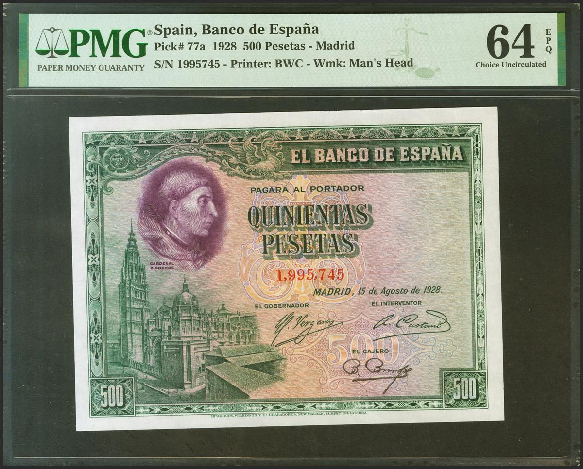 500 Pesetas. 15 de Agosto de 1928. Sin serie. (Edifil 2021: 356, Pick: 77a). Inusual en esta excepcional calidad, apresto original. SC. Encapsulado PMG64EPQ.