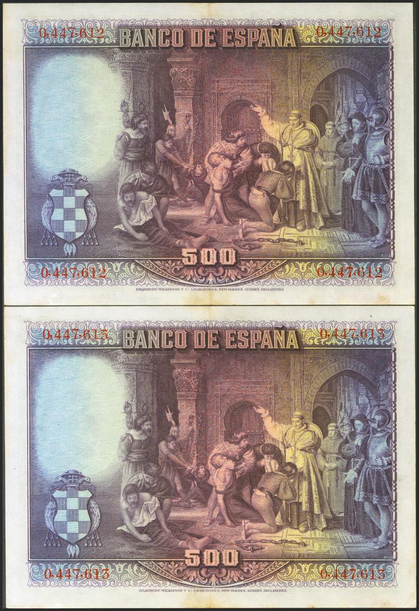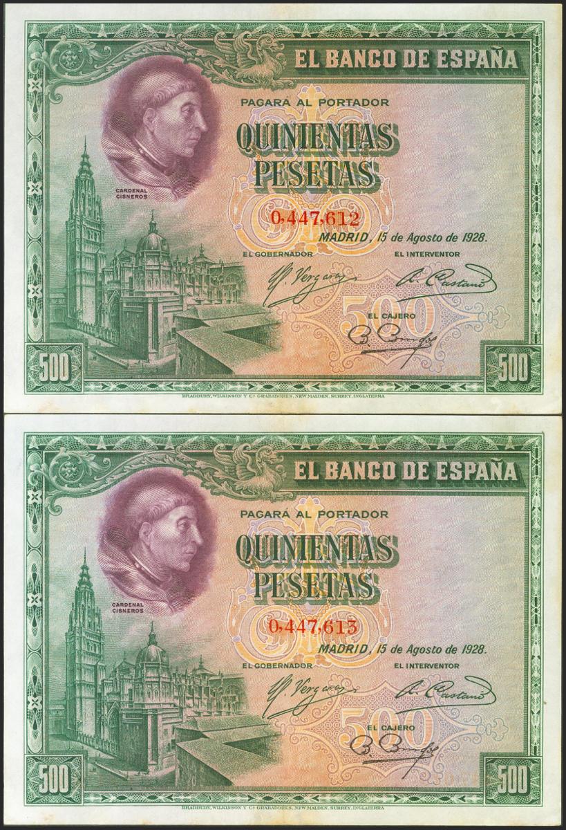 500 Pesetas. 15 de Agosto de 1928. Pareja correlativa. Sin serie. (Edifil 2021: 356). Conserva parte de su apresto original. EBC.