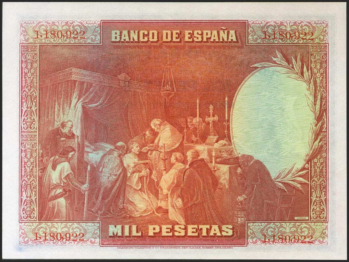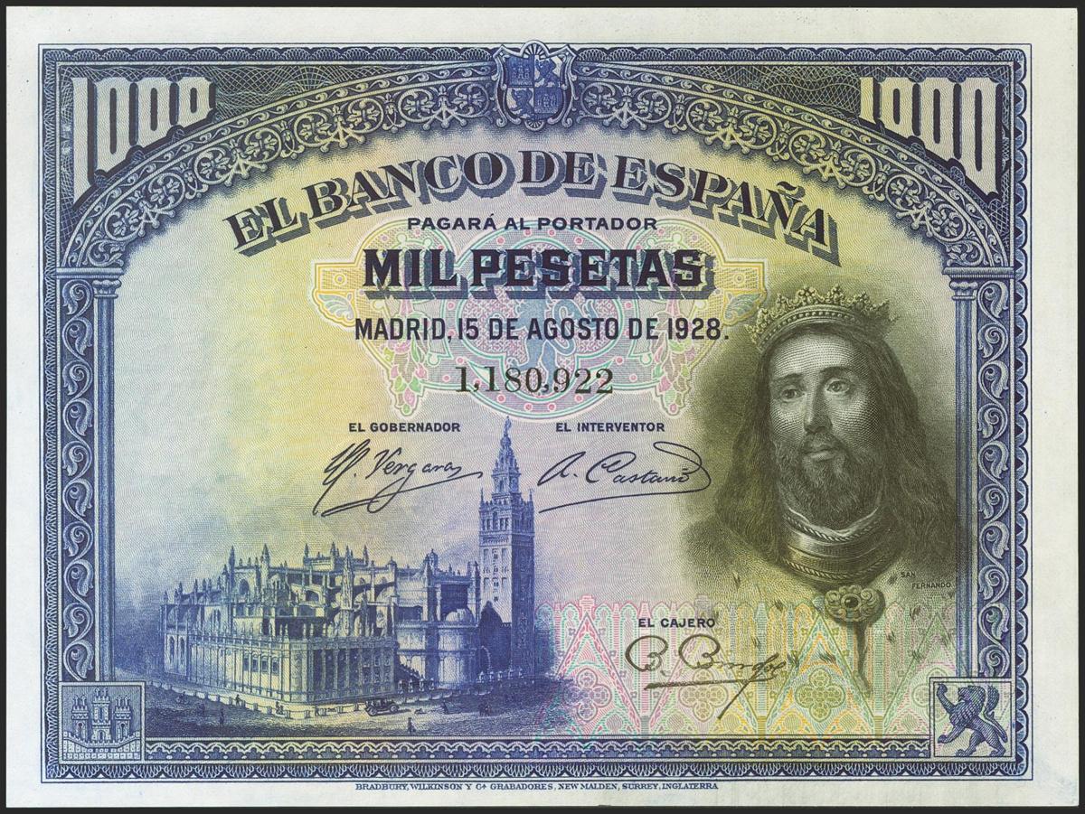 1000 Pesetas. 15 de Agosto de 1928. Sin serie. (Edifil 2021: 357, Pick: 78a). Inusual, conserva todo su apresto original. SC.