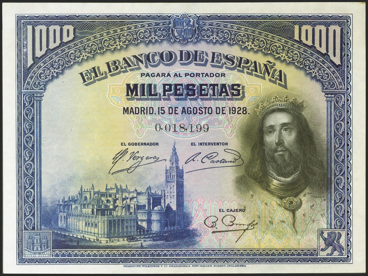 1000 Pesetas. 15 de Agosto de 1928. Sin serie, numeración baja. (Edifil 2021: 357, Pick: 78a). Conserva todo su apresto original, ondulación producida por la humedad. EBC+++.