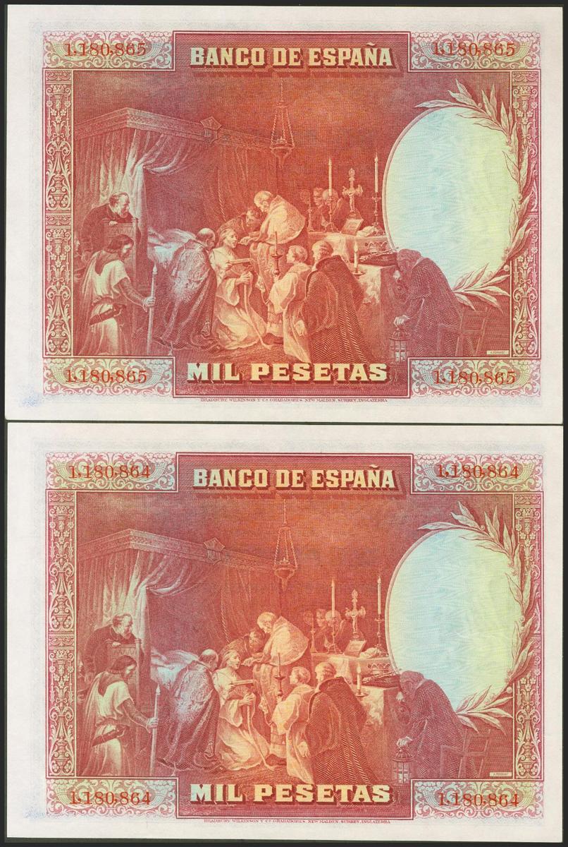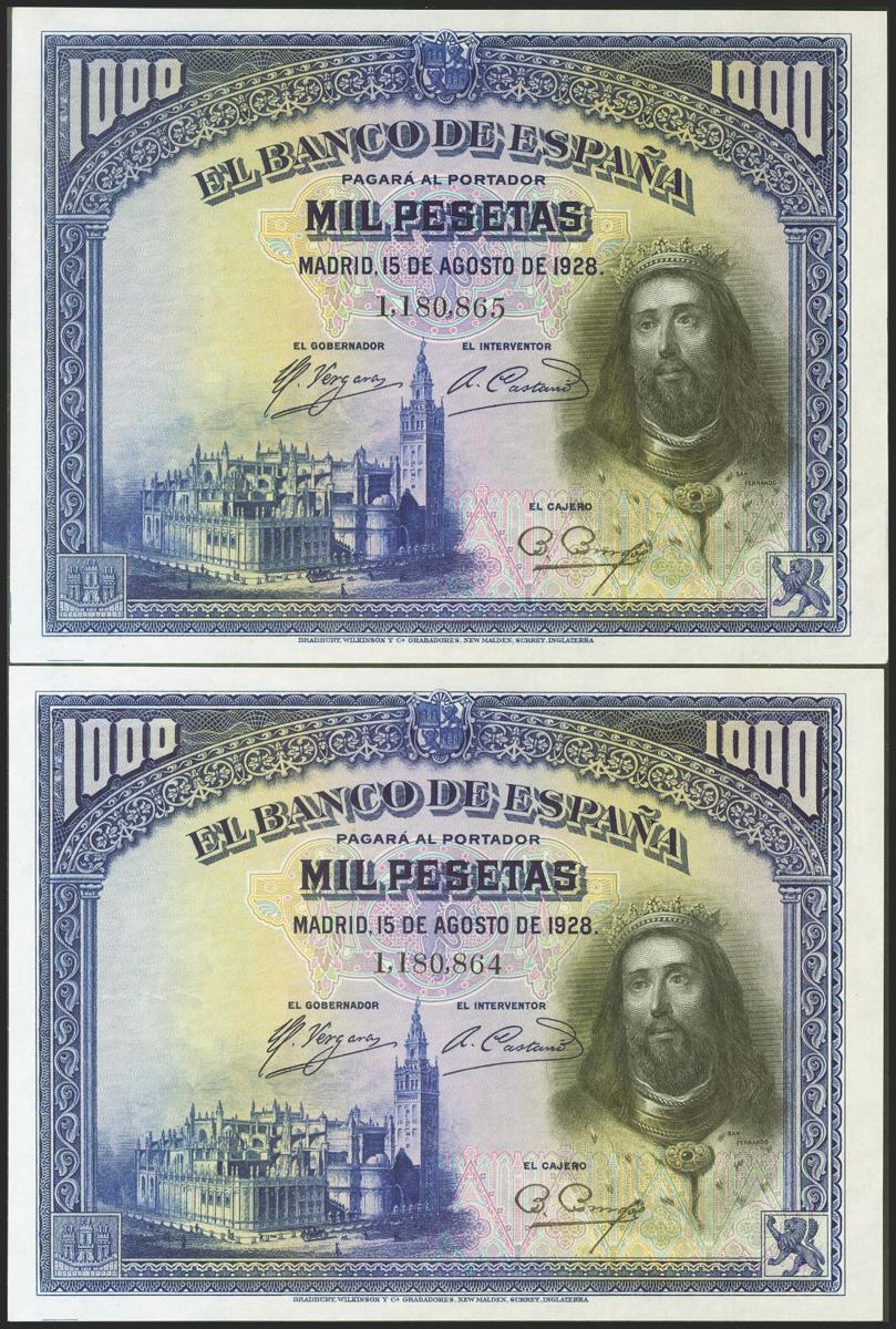 1000 Pesetas. 15 de Agosto de 1928. Pareja correlativa. Sin serie. (Edifil 2017: 357, Pick: 78a). Conserva todo su apresto original. SC-.