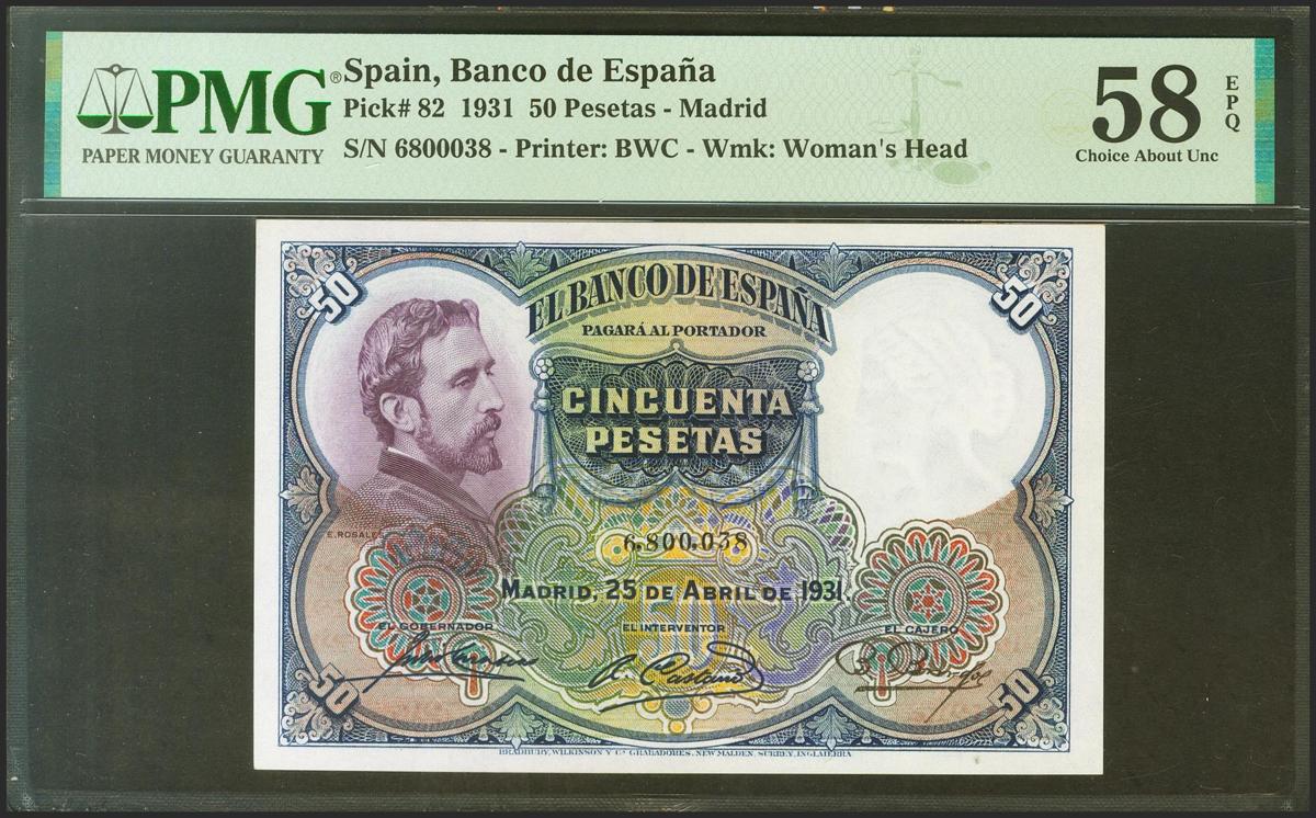 50 Pesetas. 25 de Abril de 1931. Sin serie. (Edifil 2021: 359, Pick: 82). Apresto original. EBC+++. Encapsulado PMG58EPQ.