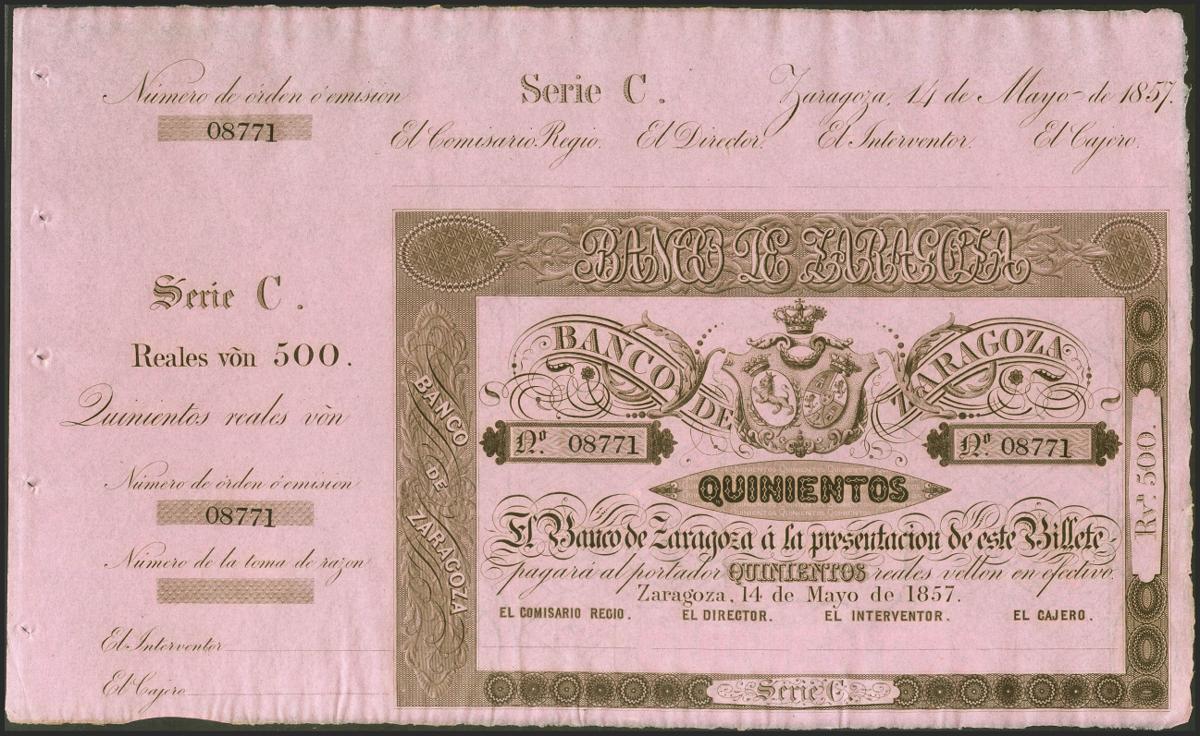 500 Reales. 14 de Mayo de 1857. Banco de Zaragoza. Serie C y con matriz. (Edifil 2021: 128B). Apresto original. SC.