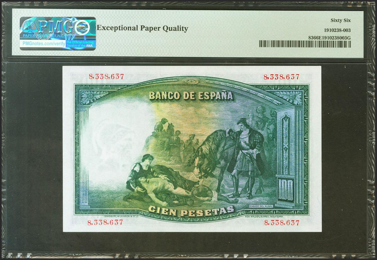 100 Pesetas. 25 de Abril de 1931. Sin serie. (Edifil 2021: 360, Pick: 83). Inusual en esta calidad, apresto original. SC. Encapsulado PMG66EPQ.