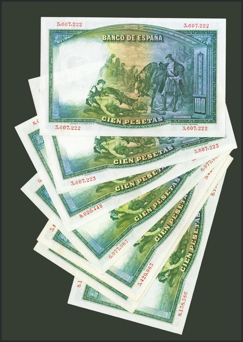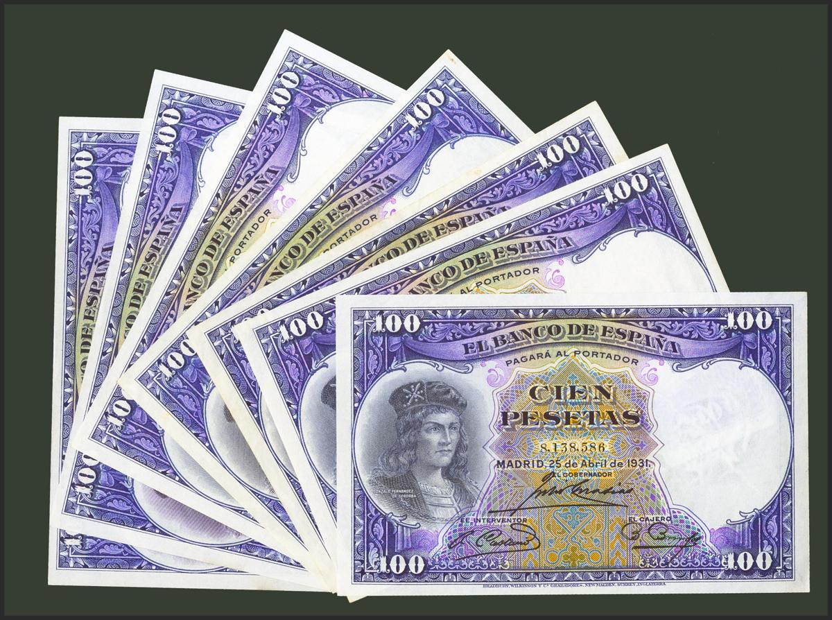 Conjunto de 7 billetes de 100 Pesetas emitidos el 25 de Abril de 1931 sin serie, incluyendo una pareja correlativa (Edifil 2017: 360). SC/EBC.