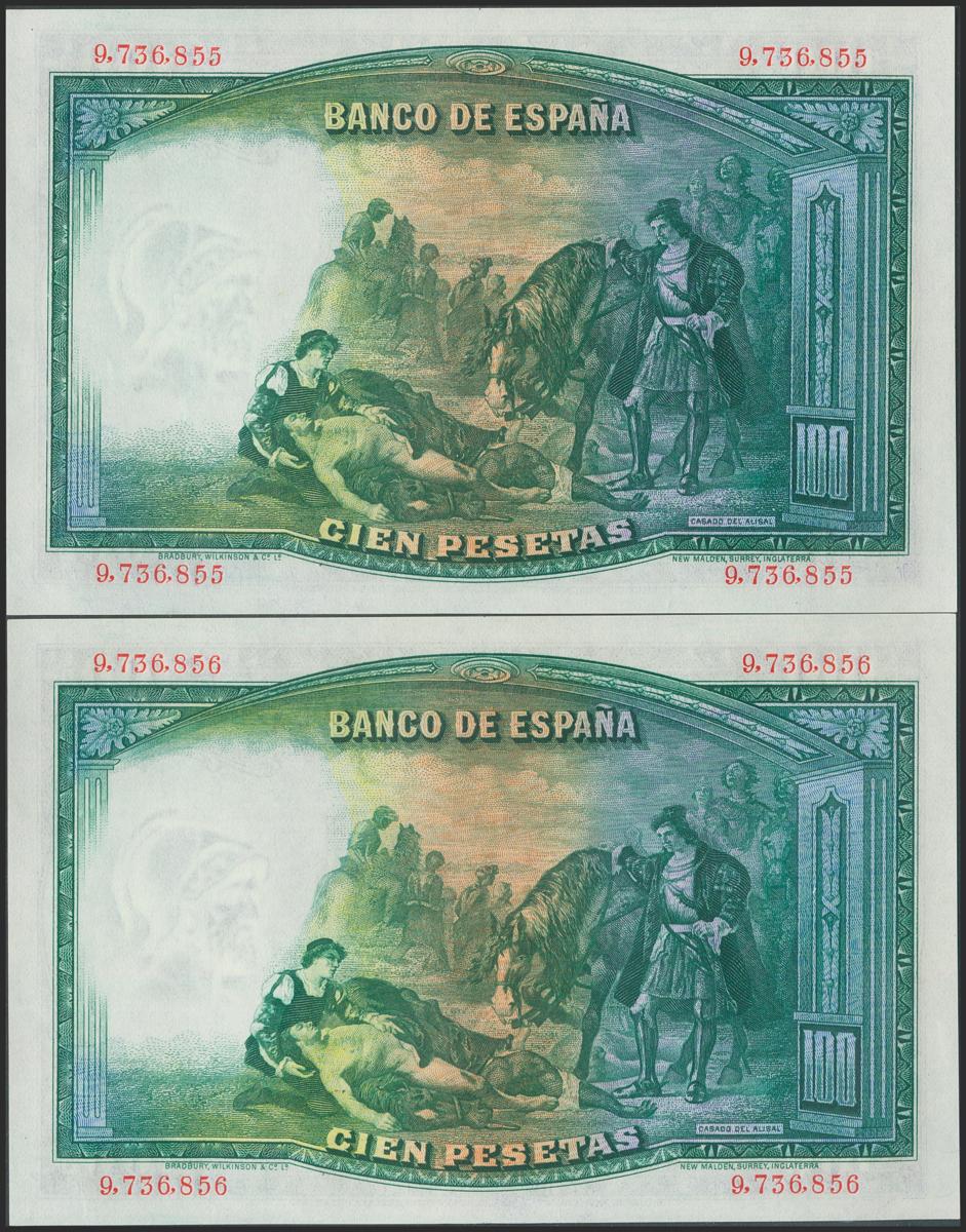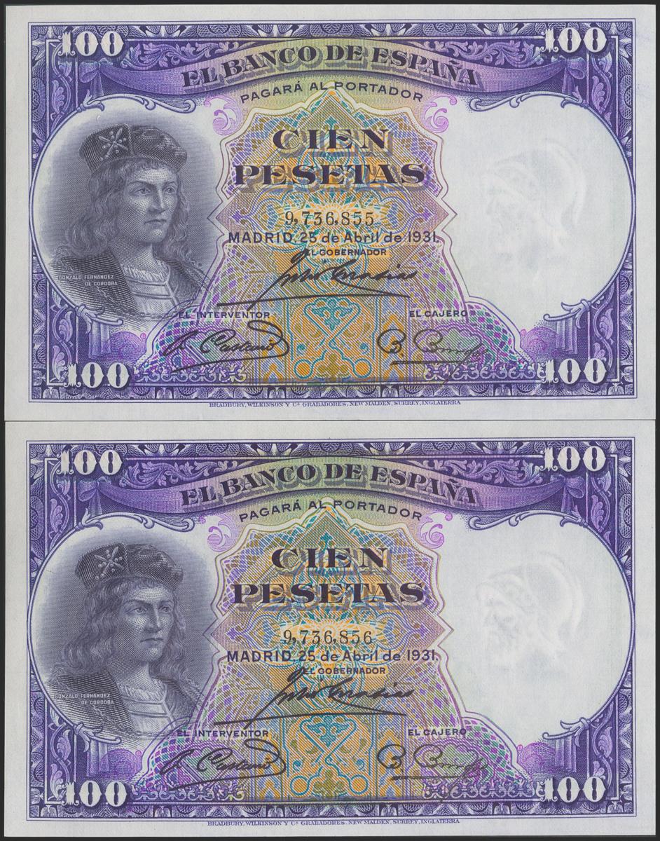 100 Pesetas. 25 de Abril de 1931. Pareja correlativa. Sin serie. (Edifil 2017: 360). Conserva todo su apresto original. SC.
